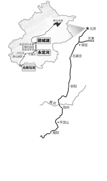 南水北调中线工程南起丹江口水库,经河南、河北,自流至北京。一期工程主要向京津冀豫供水,其中北京年均受水10.5亿立方米。
