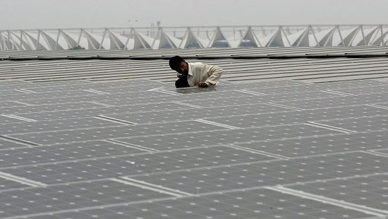 一名工人正在印度尼赫鲁体育场安装太阳能电池板。(自《悉尼先驱晨报》)