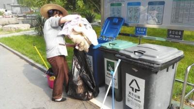 ①垃圾分类员在社区进行垃圾分拣。京华时报记者郑磊摄