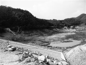 施工队正在修理水库两侧引水渠,铲车忙得热火朝天。一位姓沈的男子从工地里走出,他也是住村子里的,这段时间他就在工地里打工。得知记者身份后,他带着我们爬上了水坝。此时的清凉寺水库,只有水库底还有几摊泥水。