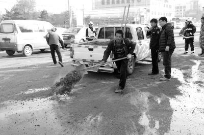 工作人员正在用沙子覆盖被油迹污染的路面。记者谭青摄