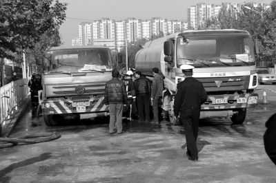 下午1点多,事故车停在青年北路上。据车身文字显示,该车为“燕山东方油品运输”所有,罐体容积为17立方米,可装载油品8吨。旁边还有一辆油罐车,为事后调来转运柴油的车辆,工作人员用油管把余下的柴油转移到该车。被水稀释过的油迹,由青年北路向西,蔓延至姚家园路,长约50米,宽约10米。空气中弥漫着柴油味。现场有3辆消防车,数名消防员沿车尾一字排开,手持水枪对准油罐车,以预防突发情况。