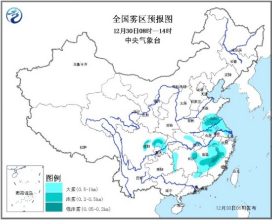 人民网北京12月30日电 (杨翼)中央气象台继续发布大雾黄色预警:预计,今天早晨到上午,山东南部、江苏大部、安徽中北部和皖南山区、浙江西部、湖北东部、湖南西部和东北部、江西大部、福建西北部、四川盆地中北部等地有大雾,其中,江苏北部、安徽北部、湖南东北部、江西中部、浙江西南部及福建西北部等6省部分地区有能见度不足500米的浓雾,局地有能见度不足200米的强浓雾。今天白天,华北东南部、黄淮东部、江淮东部、江南北部有轻到中度霾,局地重度霾。
