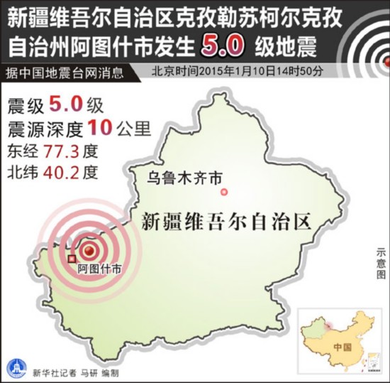 新华网快讯:据中国地震台网中心网站消息,新疆维吾尔自治区克孜勒苏柯尔克孜自治州阿图什市,北京时间1月10日14时50分,发生5.0级地震。