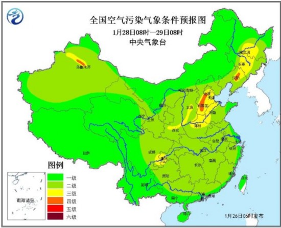 28日08时~29日08时,全国大部地区气象条件较有利于污染物的扩散和清除,空气污染气象条件以1~2级为主,其中东北地区中部、华北中南部、黄淮西北部、江汉等地为3~4级,有轻度霾。