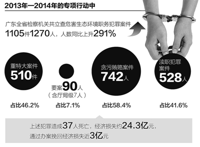 2013年到2014年,广东全省检察机关集中开展了为期两年的查办与预防危害生态环境职务犯罪专项工作,目的是保障和促进广东各项生态环境保护、资源节约、污染治理和节能减排政策的进一步落实,为生态文明建设提供有力的司法保障。广东省人民检察院1月30日公布的数据显示,广东全省检察机关共立案侦查危害生态环境职务犯罪案件1105件1270人,人数同比上升291%。其中,重特大案件510件,占比46.2%;要案90人(含厅局级7人),占比7.1%;贪污贿赂案件742人,占比58.4%;渎职犯罪案件528人,占比41.6%。上述犯罪共造成37人死亡,经济损失约24.3亿元,通过办案挽回经济损失近3亿元。