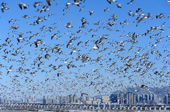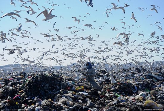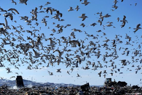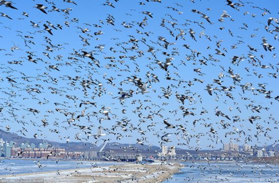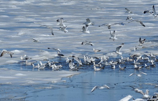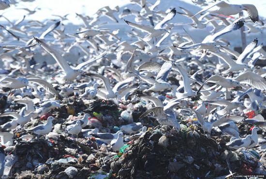 近日,渤海大连北部海域相继结冰封海,大量浮游生物、及滩涂被海冰覆盖。海鸥、野鸭等禽鸟的食物链出现短缺,海冰冰封大海,大批海鸥飞到大连市郊的垃圾场觅食。