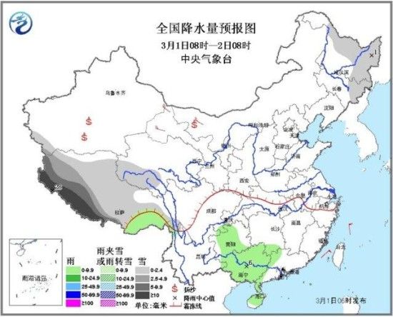 3月3日08时至3月4日08时,西藏大部、川西高原、东北地区东部、山东半岛等地有小到中雪或雨夹雪,其中黑龙江东南部、吉林东北部、西藏普兰等地有大雪,局地暴雪(10~13毫米);西南地区东部、云南西北部、江南大部、华南等地有小到中雨。内蒙古中部、华北东北部、山东半岛。渤海、黄海大部、东海、台湾海峡级以东洋面有6~8级、阵风9级的偏北风。
