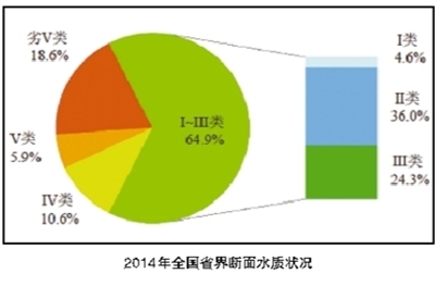 全国423条主要河流、62座重点湖泊(水库)的968个国控地表水监测断面(点位)开展了水质监测,Ⅰ、Ⅱ、Ⅲ、Ⅳ、Ⅴ、劣Ⅴ类水质断面分别占3.4%、30.4%、29.3%、20.9%、6.8%、9.2%,主要污染指标为化学需氧量、总磷和五日生化需氧量。329个地级及以上城市开展了集中式饮用水水源地水质监测,取水总量为332.55亿吨,达标水量为319.89亿吨,占96.2%。在4896个地下水监测点位中,水质优良级的监测点比例为10.8%,良好级的监测点比例为25.9%,较好级的监测点比例为1.8%,较差级的监测点比例为45.4%,极差级的监测点比例为16.1%。