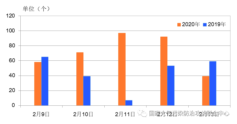 图3 2020年2月9日-2月13日重污染天气期间“2+26”城市工业热高值区与去年同期数量对比