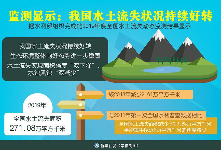 这是记者18日从水利部了解到的。监测结果显示,2019年,全国水土流失面积271.08万平方千米,较2018年减少2.61万平方千米。与2011年第一次全国水利普查数据相比,全国水土流失面积减少了23.83万平方千米,平均每年以近3万平方千米的速度减少。