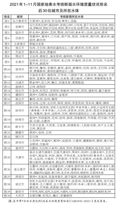 1月-11月,全国地级及以上城市中,柳州、嘉峪关和黔东南等30个城市国家地表水考核断面水环境质量相对较好(从第1名至第30名),乌兰察布、赤峰和临汾等30个城市国家地表水考核断面水环境质量相对较差(从倒数第1名至倒数第30名)。
