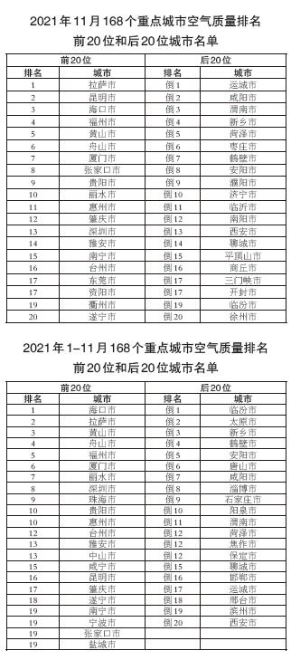 11月,168个重点城市中,拉萨、昆明和海口等20个城市空气质量相对较好(从第1名至第20名),运城、咸阳、渭南等20个城市空气质量相对较差(从倒数第1名至倒数第20名)。