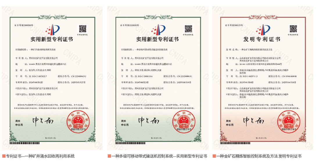 公司持续强化自主创新能力, 积极推广应用“四新”技术,切实推进“科技兴矿”战略落地见效。与此同时,与多个科研院所开展深度合作,促进创新成果的涌现与高效转化,助推企业发展。凭借对科研工作的高度重视与持续投入,黑河洛克矿业的科技实力不断增强, 目前拥有专利3项,另有5项专利正在申请中,研究内容覆盖地质找矿、采矿技术、选矿工艺等多个关键领域,为企业持续发展注入了强劲的科技动能。