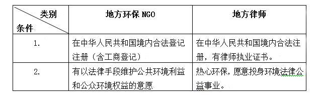 人数要求:20家地方环保NGO,每家限派一名代表;30名律师。