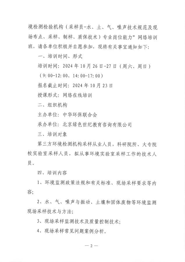 关于举办第12期“环境检测检验机构(采样员--水、土、气、噪声技术规范及现场布点、采样、制样、质保技术)专业岗位能力”网络培训班的通知