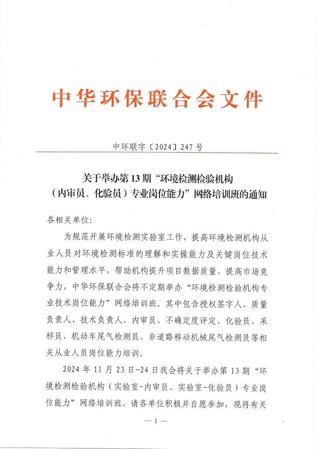 关于举办第13期“环境检测检验机构(内审员、化验员)专业岗位能力”网络培训班的通知
