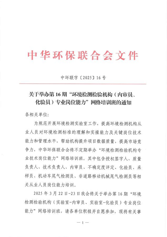 关于举办第16期“环境检测检验机构(内审员、化验员)专业岗位能力”网络培训班的通知