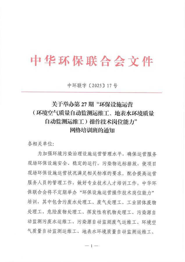 关于举办第27期“环保设施运营(环境空气质量自动监测运维工、地表水环境质量自动监测运维工)操作技术岗位能力”网络培训班的通知
