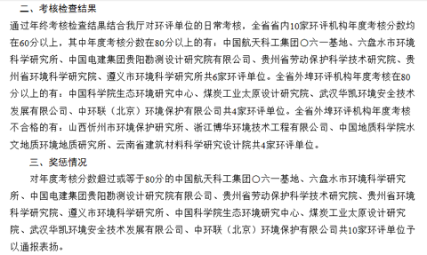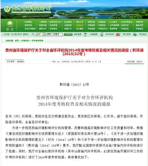 在近日贵州省环保厅配合环保部对92家环评机构(其中10家省内环评机构、82家在我省开展环评工作的外埠环评机构)进行的2014年度考核检查中(见贵州省环境保护厅关于对全省环评机构2014年度考核检查及相关情况的通报(黔环通[2015]32号)), 我公司综合评分为80分以上,并与其他9家省外环评机构一起,获得贵州省环保厅通报表扬。具体见链接。