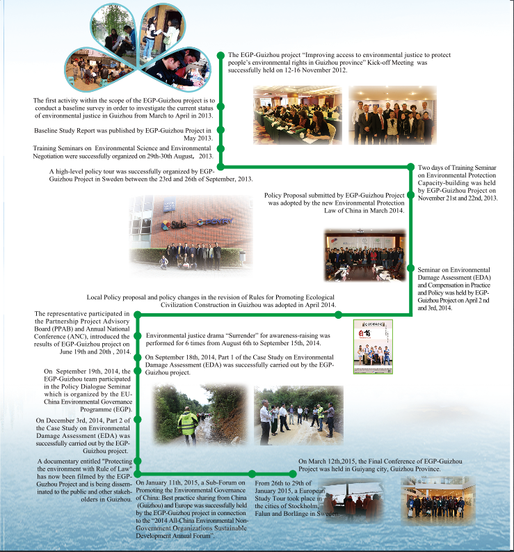 ![]() On 12th March, 2015, the final conference of EGP-Guizhou Project was held in Guiyang, Guizhou Province which marked a successful conclusion of the Project after three years’ implementation since 2012. EGP-Guizhou Project “Improving access to environmental justice to protect people’s environmental rights in Guizhou Province” is one of the 15 local partnership projects under the EU-China Environmental Governance Program (EGP) within the field of China’s environmental governance funded by the European Union. The goals of this project focused on improving the Guizhou Province’s access to environmental justice, protecting the public’s environmental rights, and contributing to the improvement of China’s environmental governance, and six work packages have been carried out including conducting a baseline survey, raising public awareness, engaging in capacity building, formulating policy recommendations, disseminating work and achievements and the entire project management. Jointly implemented by IVL Swedish Environmental Research Institute (IVL), All-China Environment Federation (ACEF), Guizhou International Cooperation Centre for Environmental Protection (GZICCEP), and Guiyang Public Environmental Education Centre (GPEEC), this three-year project focused on the Guizhou Province, and all major stakeholders have been involved including the general public, local governmental institutions and public environmental institutions, non-governmental organizations (NGOs), local judicial authorities, law firms and volunteer lawyers as well as China’s legislative organs. Polluting enterprises have also been addressed. Great efforts have been made by the project to promote the general public’s access to environmental justice and build know-how within local governmental institutions, judicial authorities, law firms and volunteer lawyers and non-governmental organizations, etc. Please see below or visit the project website at www.egp-guizhou.com for more details about the project activities and outcome. ![]() |