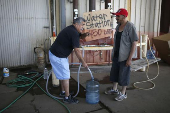 据路透社报道,在美国加州受旱最严重的城镇,一些居民要用水冲马桶,唯一的办法就是拎上水桶,开车到消防局,自己泵水带回家。