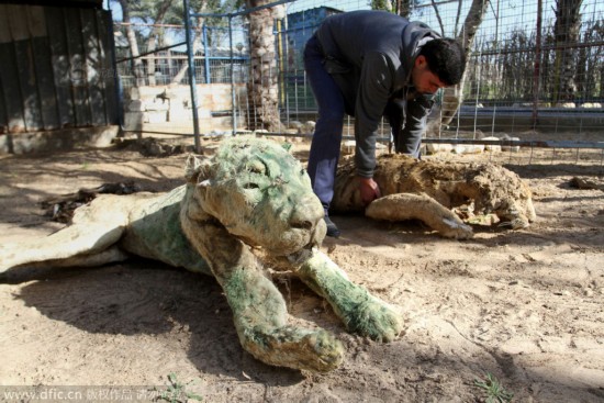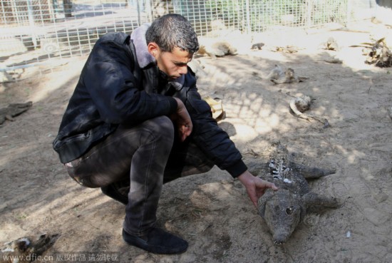 当地时间2015年1月31日,加沙汗尤尼斯,巴勒斯坦工作人员正在检查当地动物园内死去的动物。由于以色列超过51天对动物园附近的连续轰炸导致该园的主人无法照料园内的动物,使得园内25种动物死亡。供图:东方IC